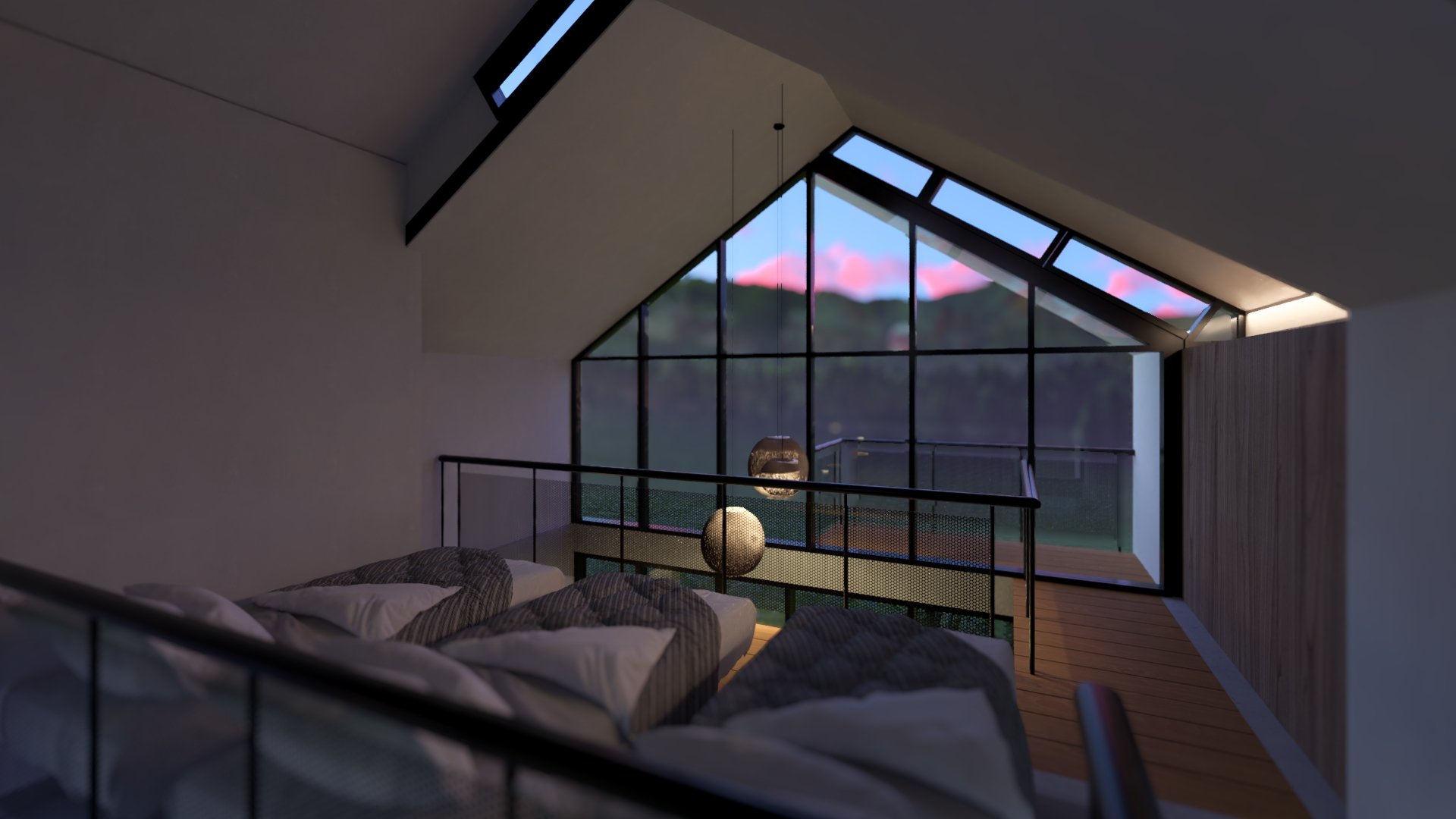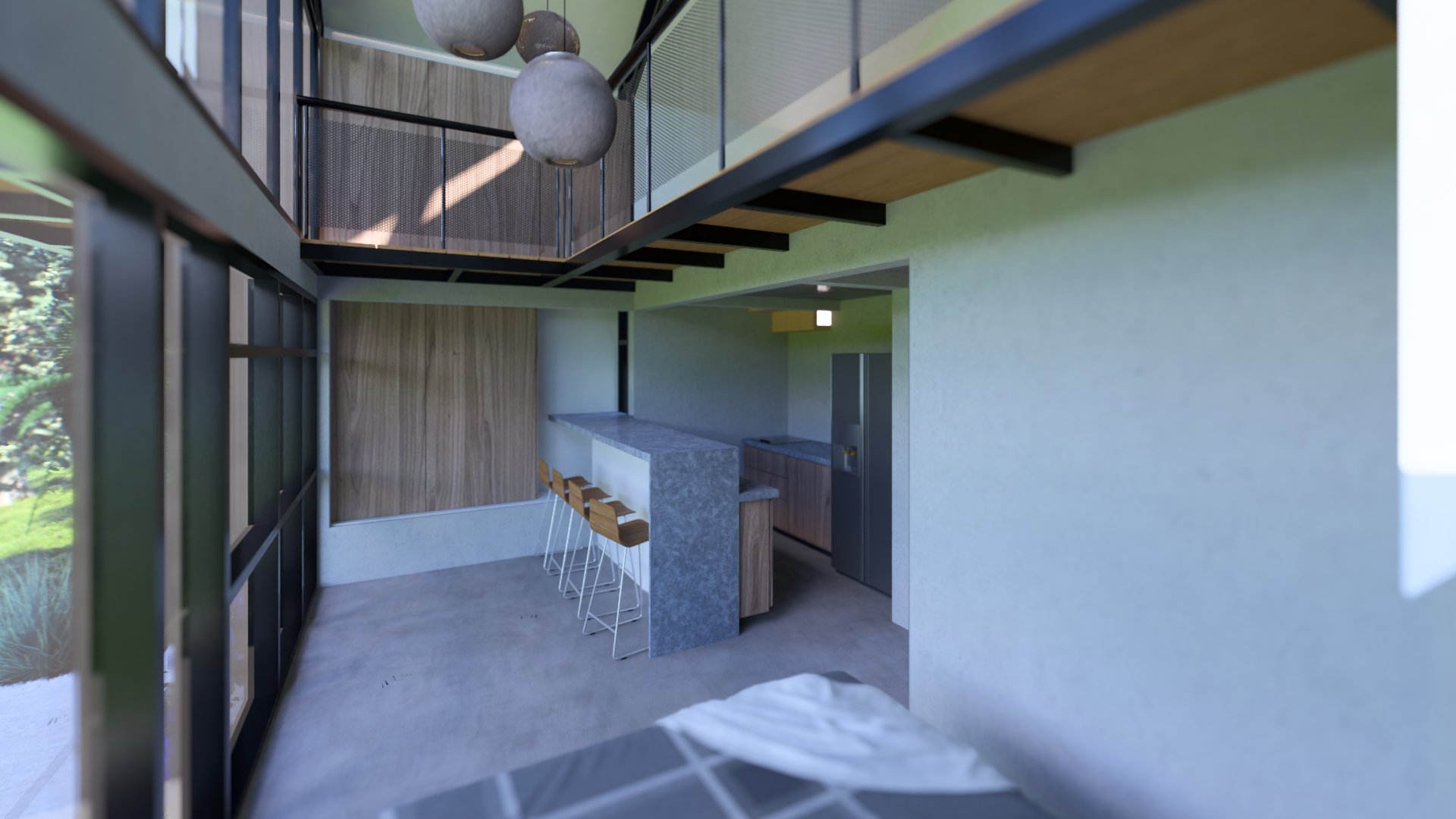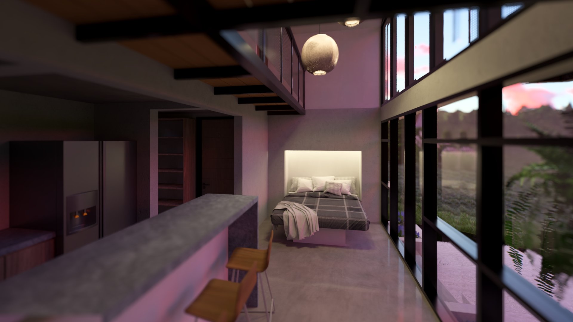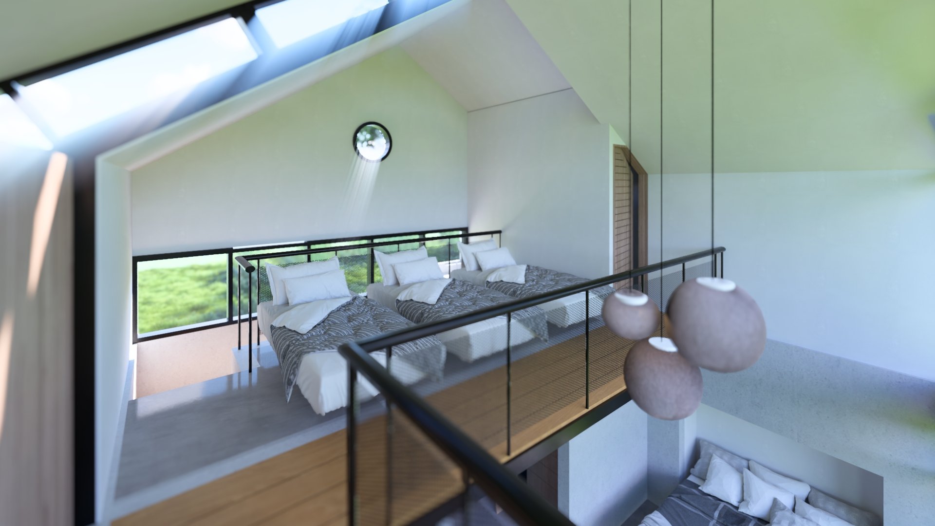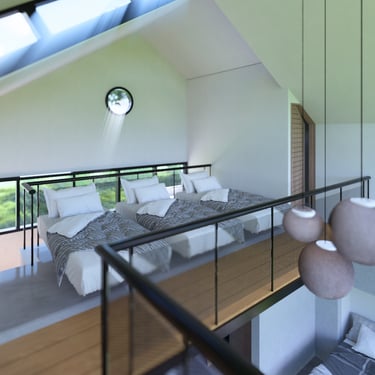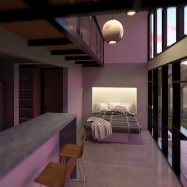 Conceived as a 30 m² micro-refuge with a 12 m² mezzanine, Casa Cusuca is small in footprint but generous in experience. It features two full bathrooms, and a living room that transforms into a complete bedroom through a Murphy bed system. Above, the open mezzanine adapts as either an additional bedroom or a barrack-style sleeping area for multiple children — a space designed for laughter, stories, and shared childhood adventure.
