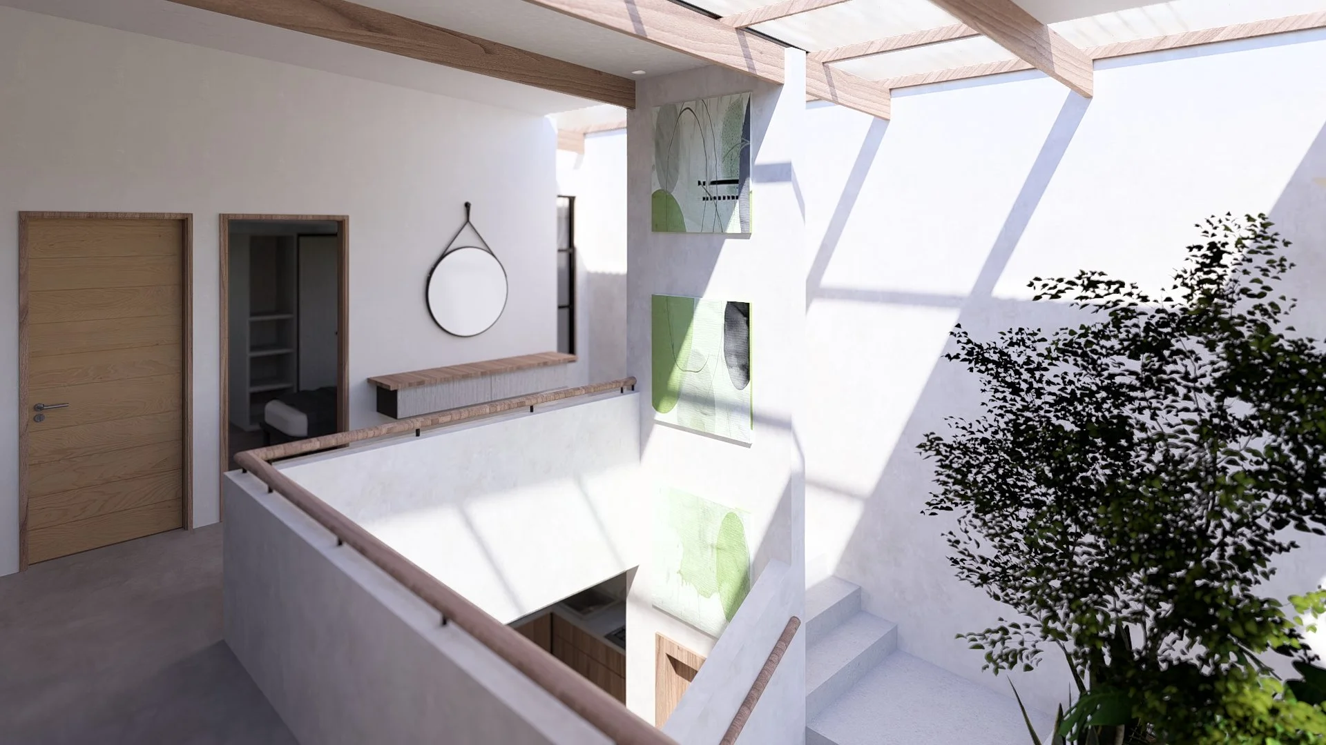 La distribución lineal surge del terreno, pero el contraste entre el repello blanco y los tonos oscuros hacen que recuerde a su instrumento favorito. La batería, que ocupa un lugar especial en el corazón de la casa.